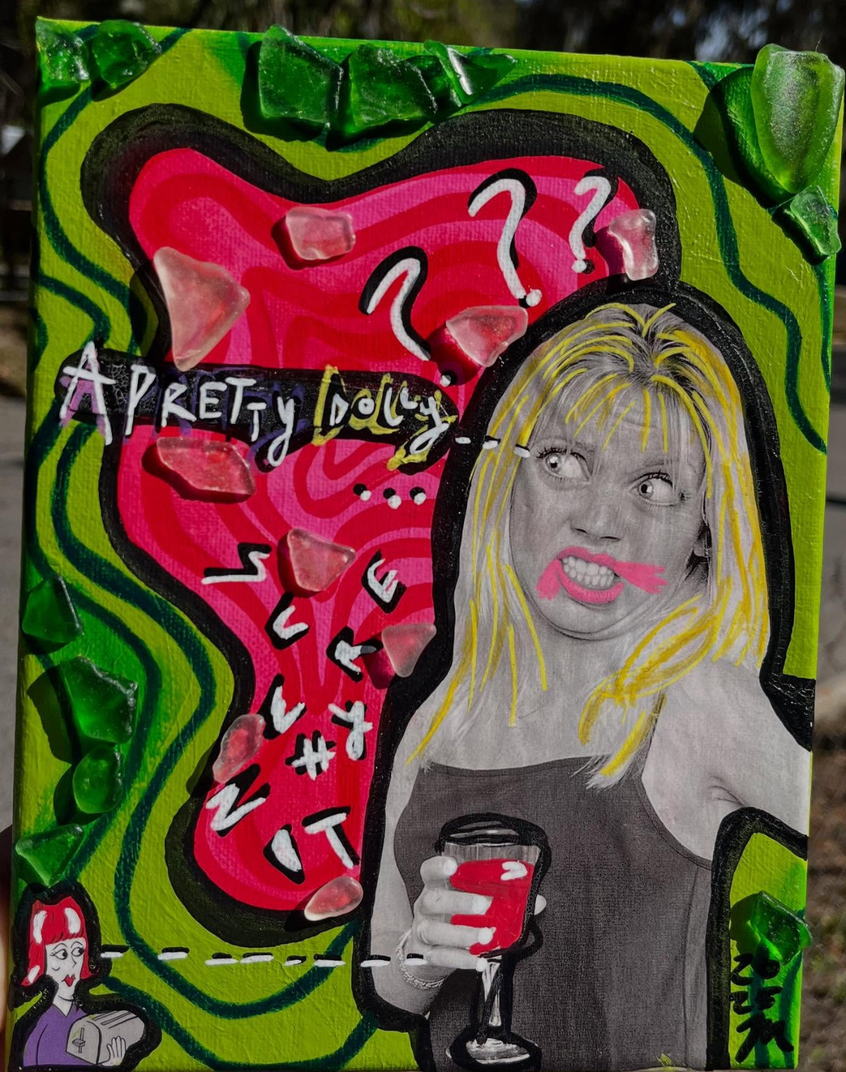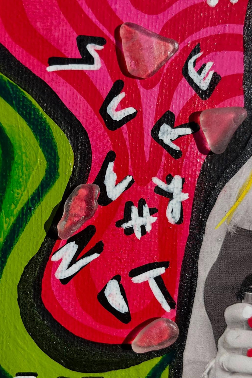 Acrylic, gel sticks, magazine clippings, and sea glass.